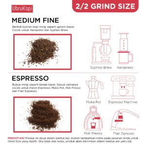 Bubuk mirip seperti bedak kasar. Sesuai namanya cocok untuk mesin Espresso, Moka Pot, Rok Presso dan Flair Espresso.