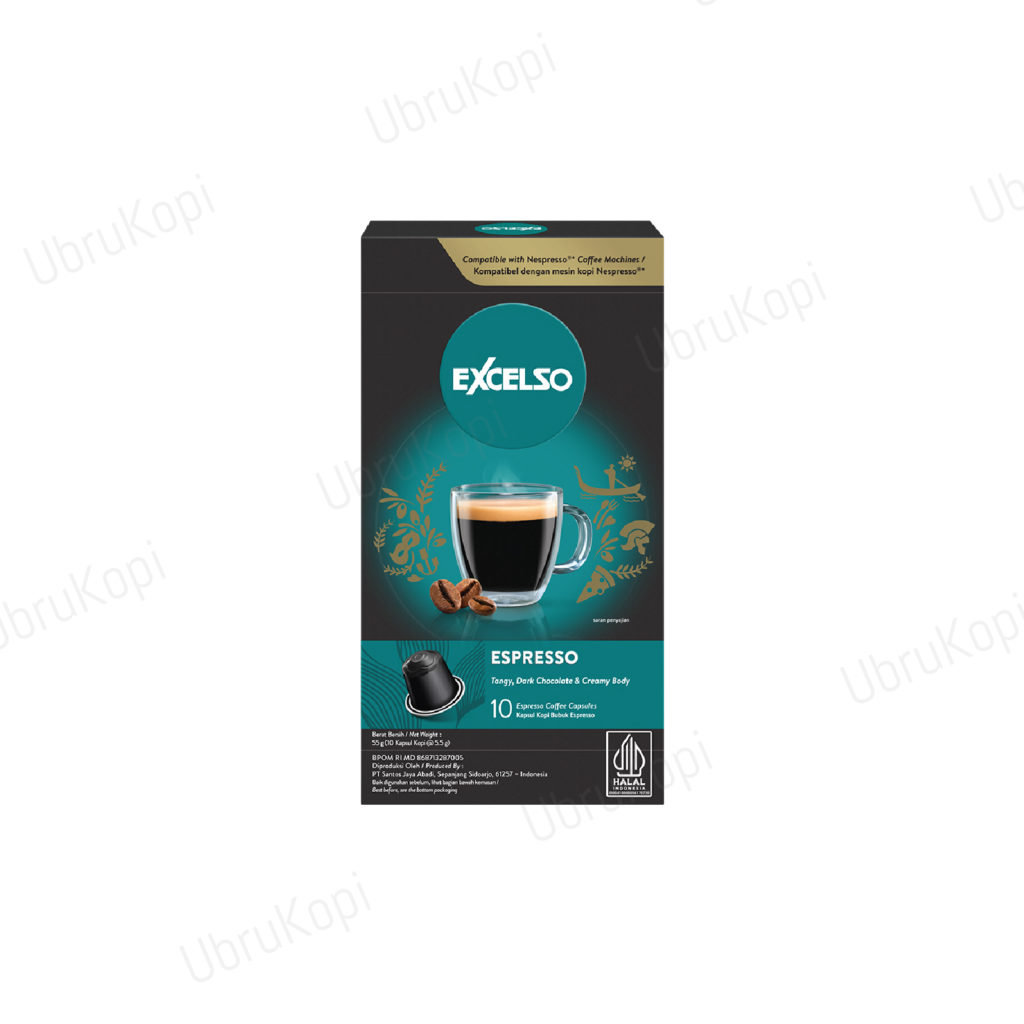 Excelso Kopi Kapsul Espresso merupakan perpaduan kombinasi biji kopi arabica dan robusta di panen di perkebunan Robusta. Memiliki aroma dark choccolate yang kuat sangat cocok untuk kamu para pecinta kopi strong.